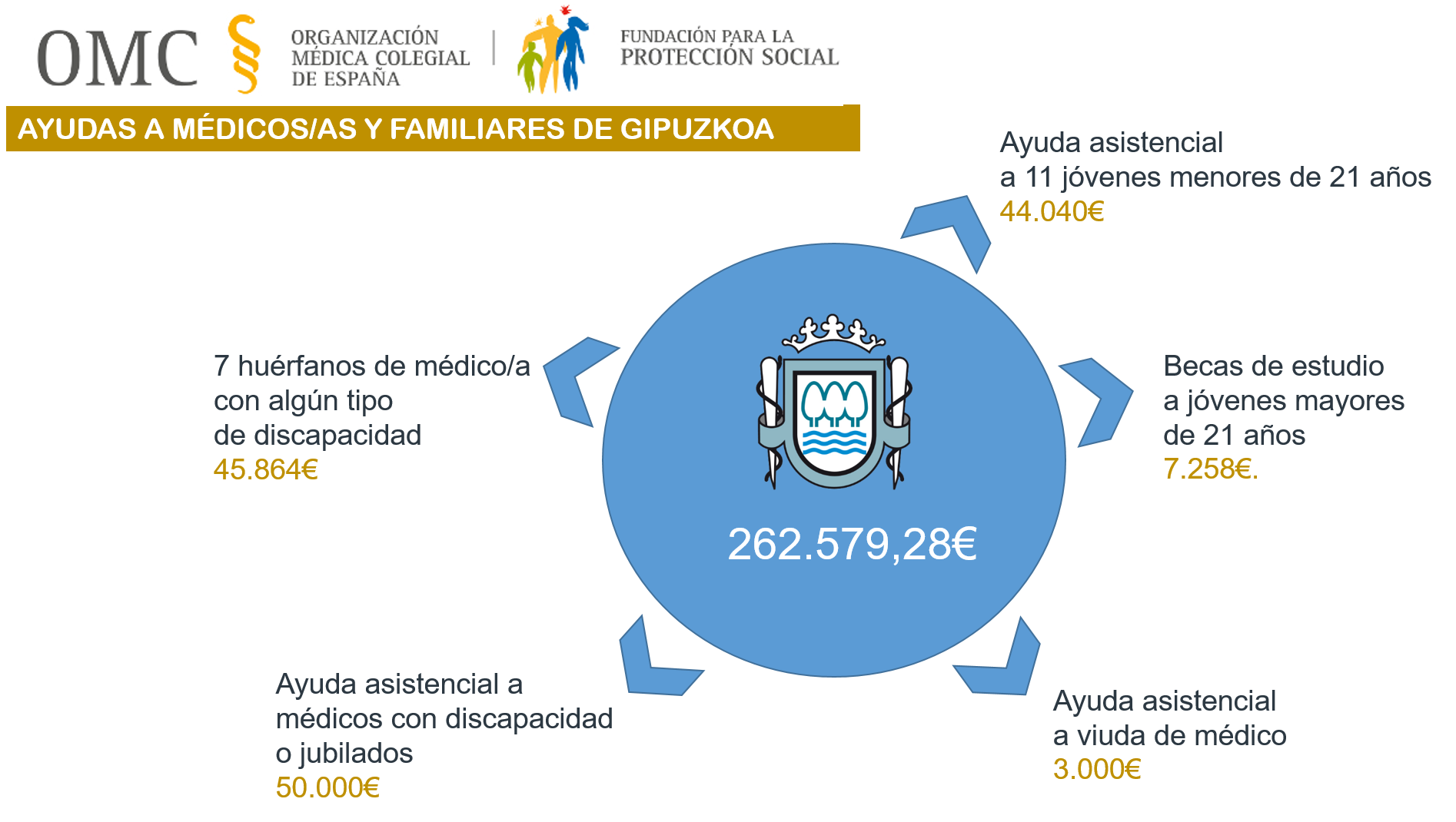 La Fundación para la Protección Social de la OMC es el órgano de solidaridad de todos los médicos colegiados de España. En Gipuzkoa son 2.701 las y los colegiados que voluntariamente están adheridos a esta Fundación. Gracias a sus aportaciones, el Colegio de Médicos de Gipuzkoa consiguió recaudar 262.579,28€ en el año 2020 que han servido para dar protección tanto a médicos/as con necesidades como a sus familiares.