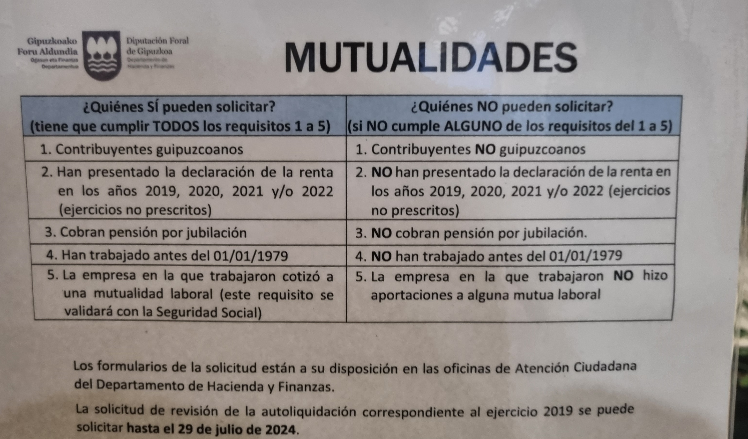 Ante la Sentencia nº 255/2023 de 28 de febrero de 2023 dictada por el Tribunal Supremo respecto a la reclamación por las cotizaciones realizadas a las Mutualidades Laborales hasta diciembre de 1978, la Hacienda Foral de Gipuzkoa dispone de un formulario para realizar la reclamación: Formulario solicitud Hacienda (No hace falta aportar ninguna documentación adicional)